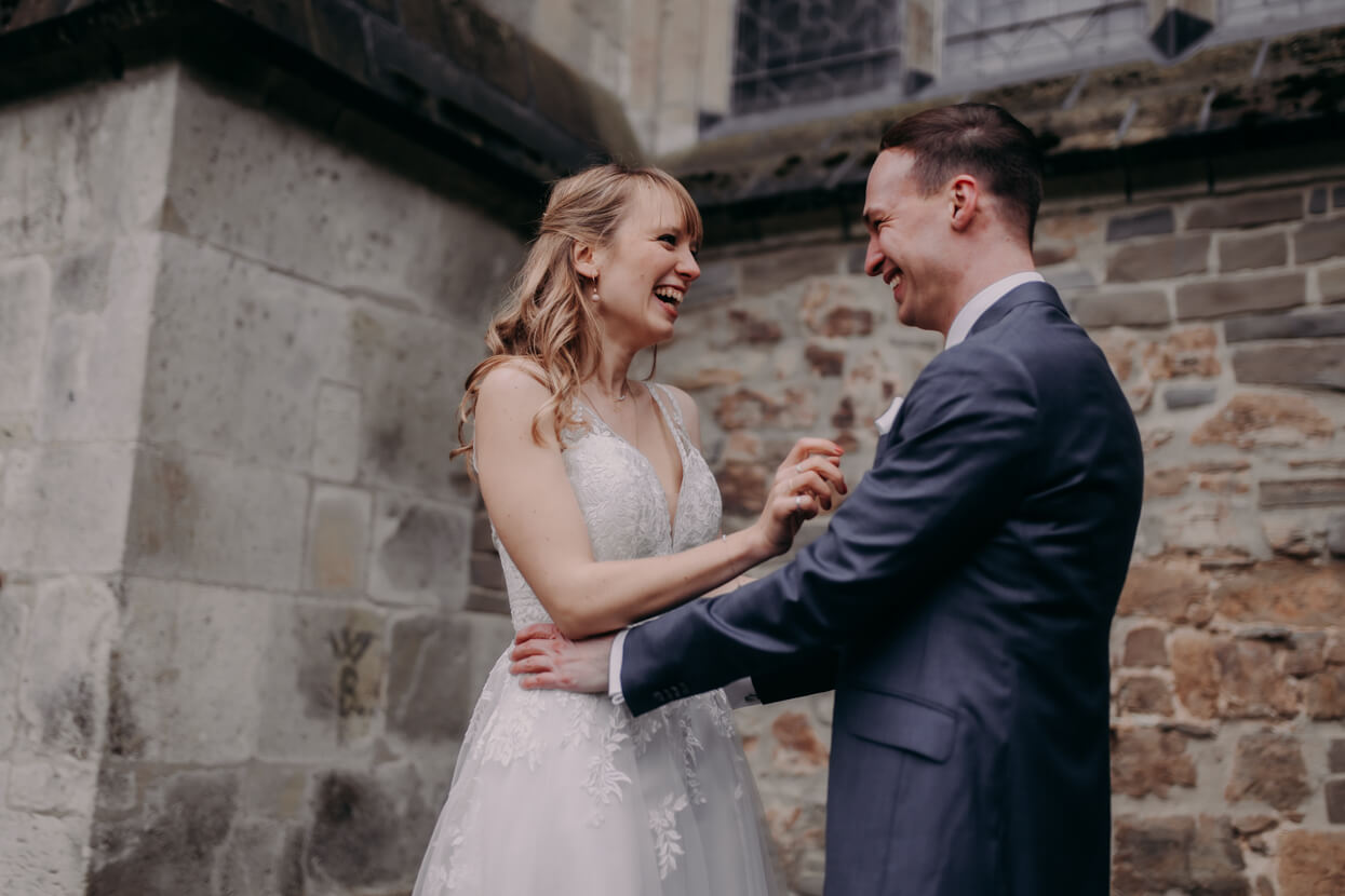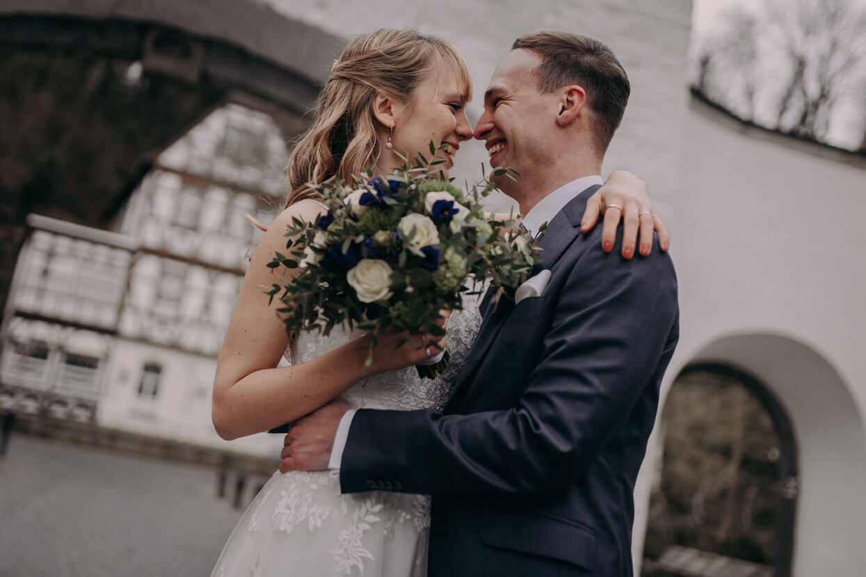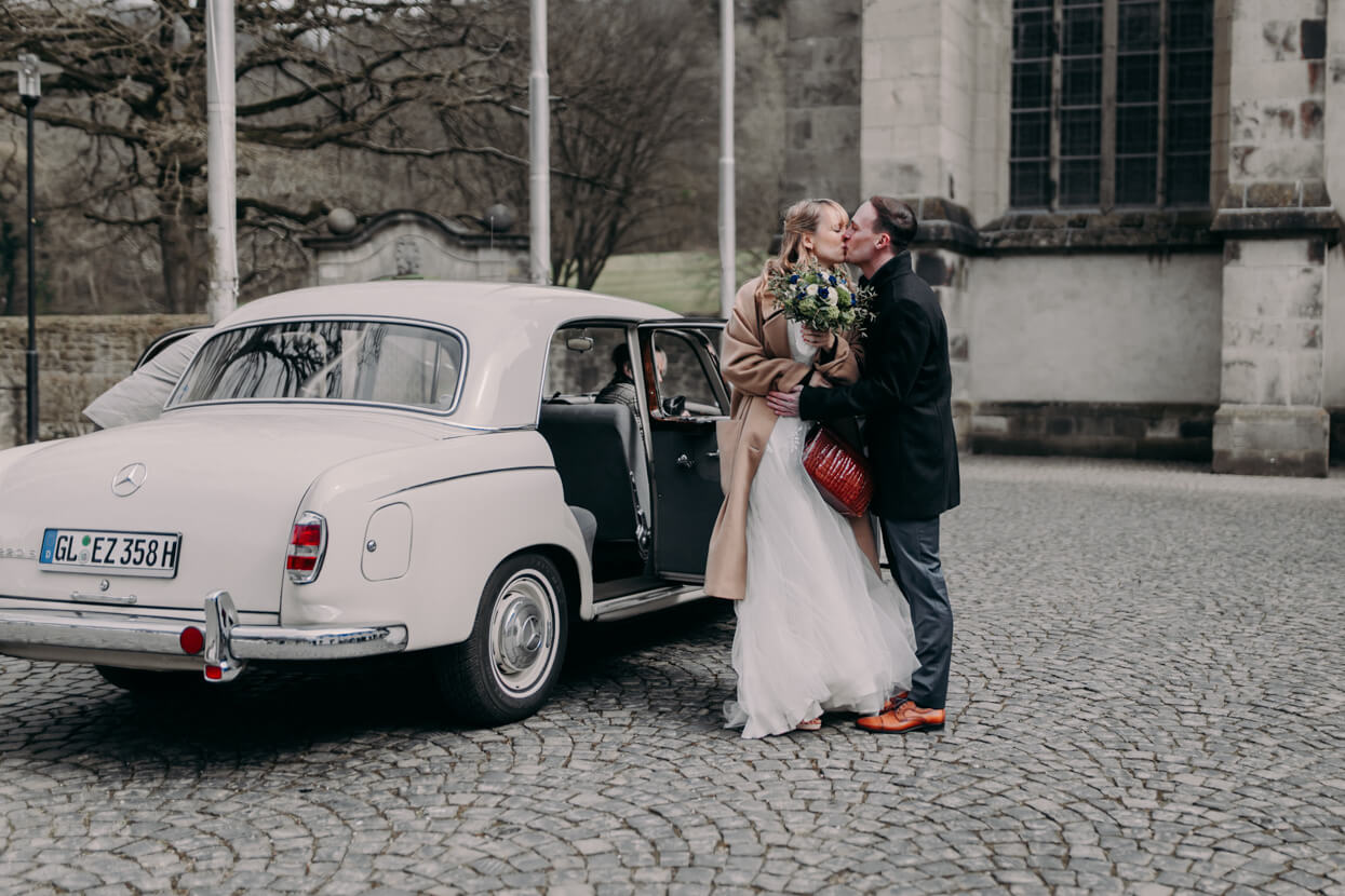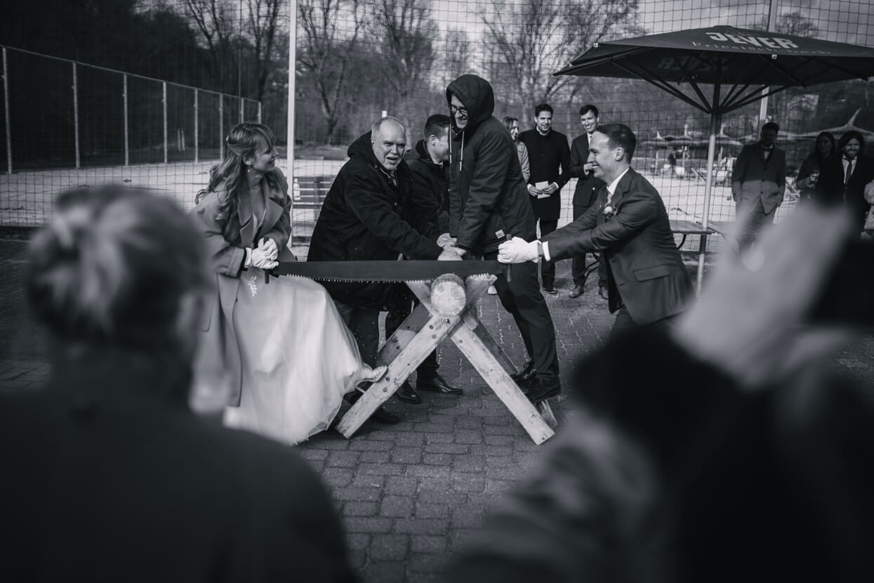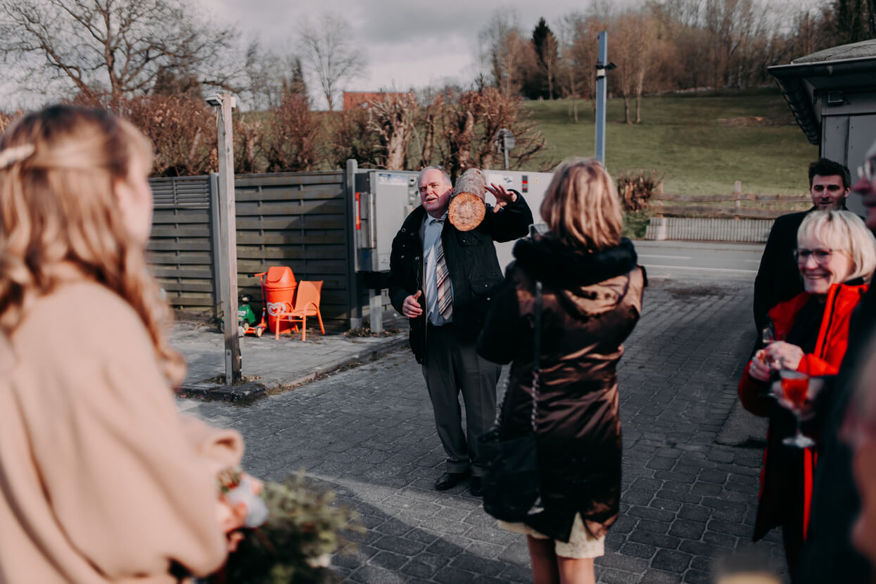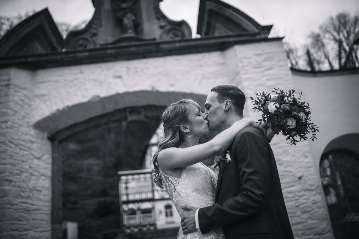 Wow, was ein toughes Paar! Als die beiden Anfang April im Altenberger Dom in Bergisch Gladbach geheiratet haben lag auf den Bergen drumherum noch Schnee. Trotzdem haben wir die tolle Kulisse für ein Paarshooting genutzt – ich in dicken Wintersachen und die beiden in ihrem wunderbaren (nur leider nicht besonders warmen) Hochzeitsoutfit. Das nenn ich wahren Einsatz, der mit superschönen Fotos belohnt wurde. Später konnten sich Kim und David beim traditionellen Baumstammsägen wieder aufwärmen und anschließend mit all ihren Lieben in der tollen Atmosphäre des Alten Schwimmbads ausgelassen feiern. Danke, dass ich Euch begleiten durfte – es hat mega Spaß gemacht!